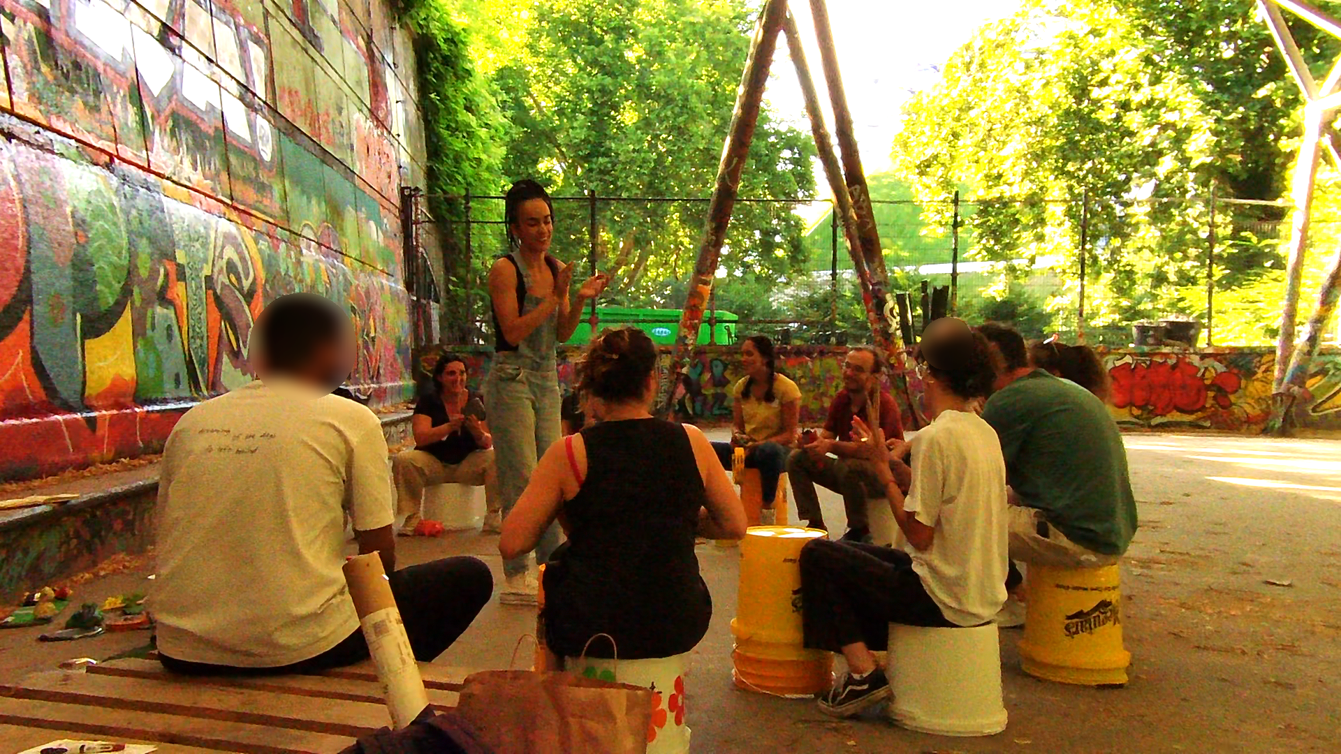 Le deuxième temps : les participant.e.s s’approprient à leur tour les instruments de récupération et sont guidés pas à pas vers une pratique rythmique libre, ludique et radicalement joyeuse.